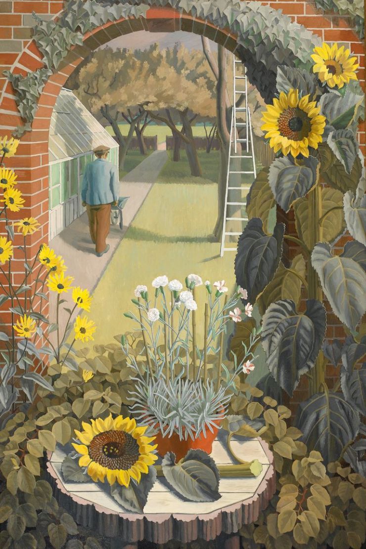 Above is shown ‘The Garden’ by Charles Mahoney who had a passion for giant architectural plants, painted the sunflowers that other friends planted.
