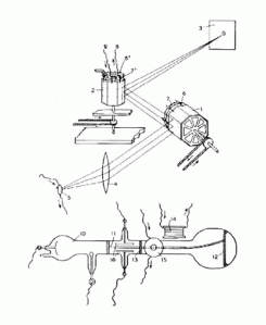 Indeed, as early as 1908, the Scottish engineer A A Campbell Swinton (1863 – 1930) had published a letter in which he outlined his concept for ‘distant electric vision’ using the cathode-ray tube, invented in 1897 by German physicist Karl Ferdinand Braun (1850-1918). A cathode-ray tube is a glass tube, from which the air has been removed, in which a beam of electrons strikes a flat screen. The inside of the screen is coated with chemical compounds called phosphors, which glow wherever electrons collide with them. Electromagnets positioned around the tube control the direction of the beam, and the television signal fed to the magnets causes the beam to scan in horizontal lines across the screen.