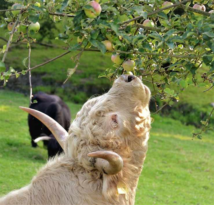 Cows regularly seek out plants they sense they need. They pick up blackberries, various leaves – hawthorn or willow, herbs – wild thyme and sorrel, even stinging nettles. But cows’ particular favourites are apples.