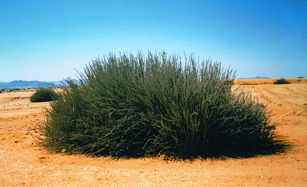In the northern part of Namibia grows a remarkable plant, Welwitschia. It is one of the world’s most bizarre plants. Some of these are estimated to be at least 1,500 years old. The plant has a short trunk fed by a long taproot and two or three strap-shaped leaves that grow continuously and can reach up to four metres in length. Although those leaves are never shed, they fray and shred over time, the strips often tangled and strewn on the parched ground. The strips fulfill a vital role for the plant, which is able to obtain valuable moisture from morning dew through the structures on the surface of the leaves. These ancient plants, endemic to Namibia, are pollinated by insects attracted by the nectar produced by the plant’s small brown cones.