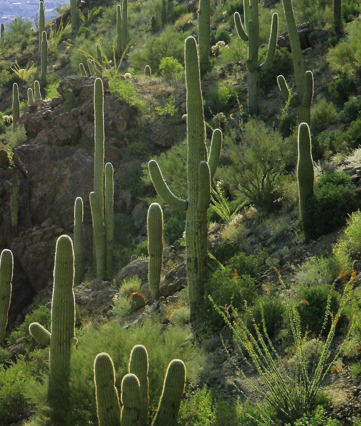 The Sonoran Desert is renowned for its cacti and other succulents, but one species stand out as a familiar symbol of the desert ecosystem: the Saguaro or Arizona Giant Cactus. The Saguaro is a slow-growing but potentially large plant. After a few decades, it can attain 10 or even 15 metres in height. The oldest Saguaro may be 200 years old, with a girth of 3 metres plus, and carrying thirty or forty ‘arms’. Those limbs-branches contribute to the tree’s sculptural and anthropomorphic character. Saguaro has a single trunk which, together with the limbs, forms a central component in this plant’s impressive water-storing capacity. The structure of the plant is essentially a robust cylinder of wooden rods surrounded by absorbent pulpy tissue and encased in an outer skin made of ribs and grooves, giving it a fluted appearance. As the skin expands, it allows the Saguaro to absorb water and then retain it within the pulpy tissue. The bigger the plant, the more water it can store, and therefore it is more able to withstand periods of severe drought, and can visibly increase its size after rainfall. When they are ‘full’ the skin appears less fluted, and once fully charged with water, a Saguaro can survive for several years before needing to refill.