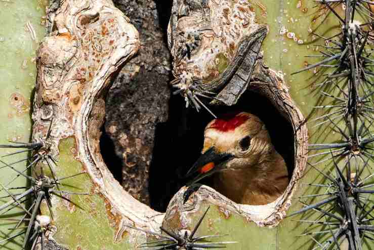 A common sight around Saguaro cacti is the Gila Woodpecker which uses the same nest holes for several years. Newly excavated nest holes are not used straight away as the woodpecker must wait for the sap to harden before moving in.