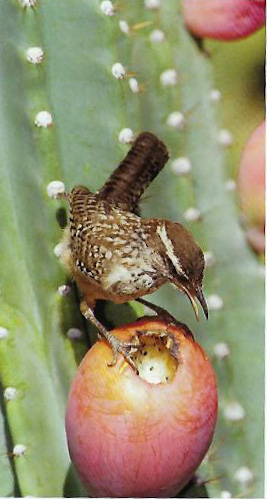 The Cactus Wren lives mainly on insects, but takes advantage of the Saguaro seasonal fruit. It also nests in Saguaro, building its nest in existing holes or a dense clump of spines.