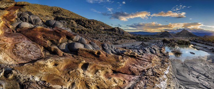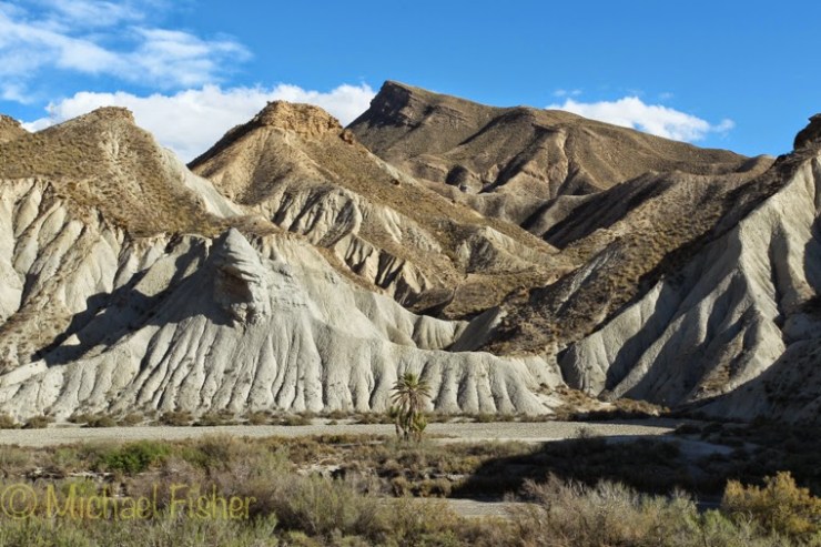 The closest Europe has to a true desert is located in south-east Spain, some 20 kilometres north of the city of Almeria. It is a shallow depression between the Sierra de Los Filabres to the north and the Sierra Alhamilla to the south. This was the area’s fossilised coral reefs that during the Miocene period eight million years ago formed part of the seafloor. Since being cut off from the Mediterranean by tectonic movement, it is now one of Iberia’s most unusual and distinctive landscapes, characterised by dramatic complexes of ridges, plateaux and deep gullies gouged out by natural processes of erosion. The desert itself is almost completely devoid of trees.