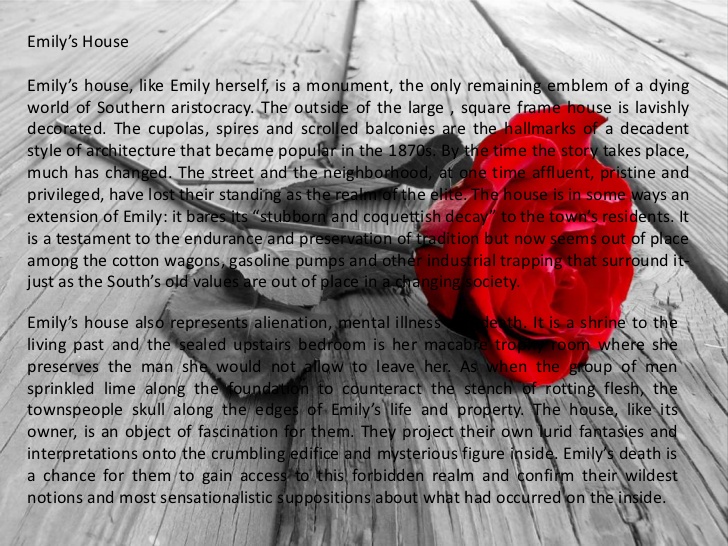 “And so she died. Fell ill in the house filled with dust and shadows, with only a doddering servant man to wait on her. We did not even know she was sick. She died in one of the downstairs rooms, in a heavy walnut bed with curtains, her grey head propped on a pillow yellow and moldy with age and a lack of sunshine. They held the funeral on the second day, with the town coming to look at Miss Emily beneath a mass of bought flowers.”