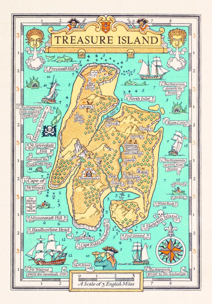 The paper had been sealed in several places with a thimble by the way of a seal; the very thimble, perhaps, that I had found in the captain’s pocket. The doctor opened the seals with great care, and there fell out the map of an island, with latitude and longitude, soundings, names of hills, and bays and inlets, and every particular that would be needed to bring a ship to a safe anchorage upon its shores. It was about nine miles long and five across, shaped, you might say, like a fat dragon standing up, and had two fine landlocked harbours, and a hill in the center part marked “The Spy-glass.” There were several additions of a later date; but, above all, three crosses of red ink – two on the north part of the island, one in the south-west, and besides this last, in the same red ink, and in the small, neat hand, very different from the captain’s tottery characters, those words: – “Bulk of treasure here.”